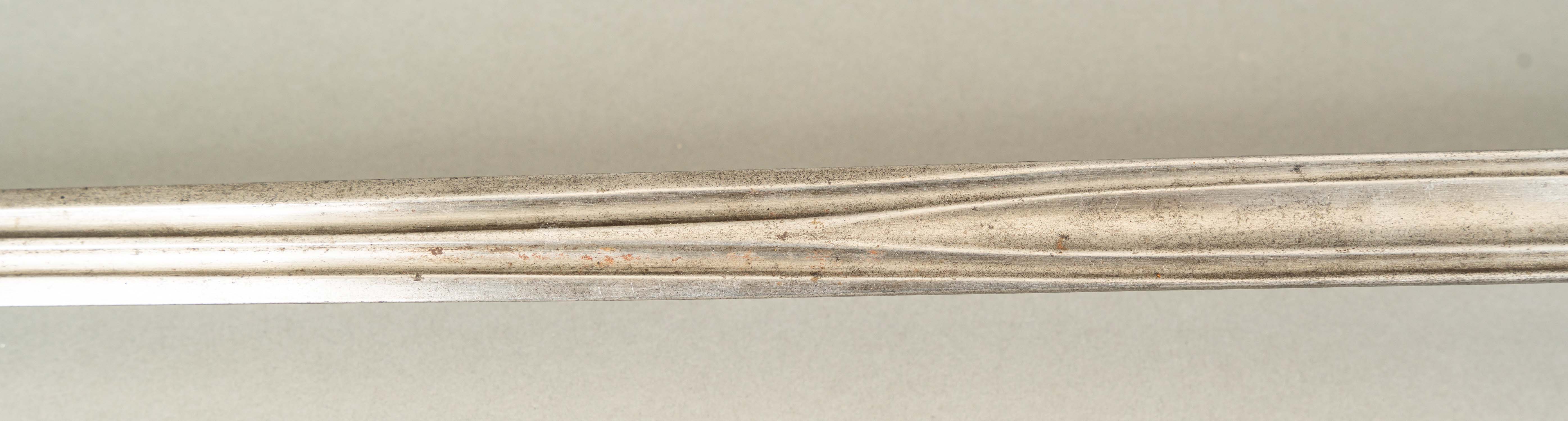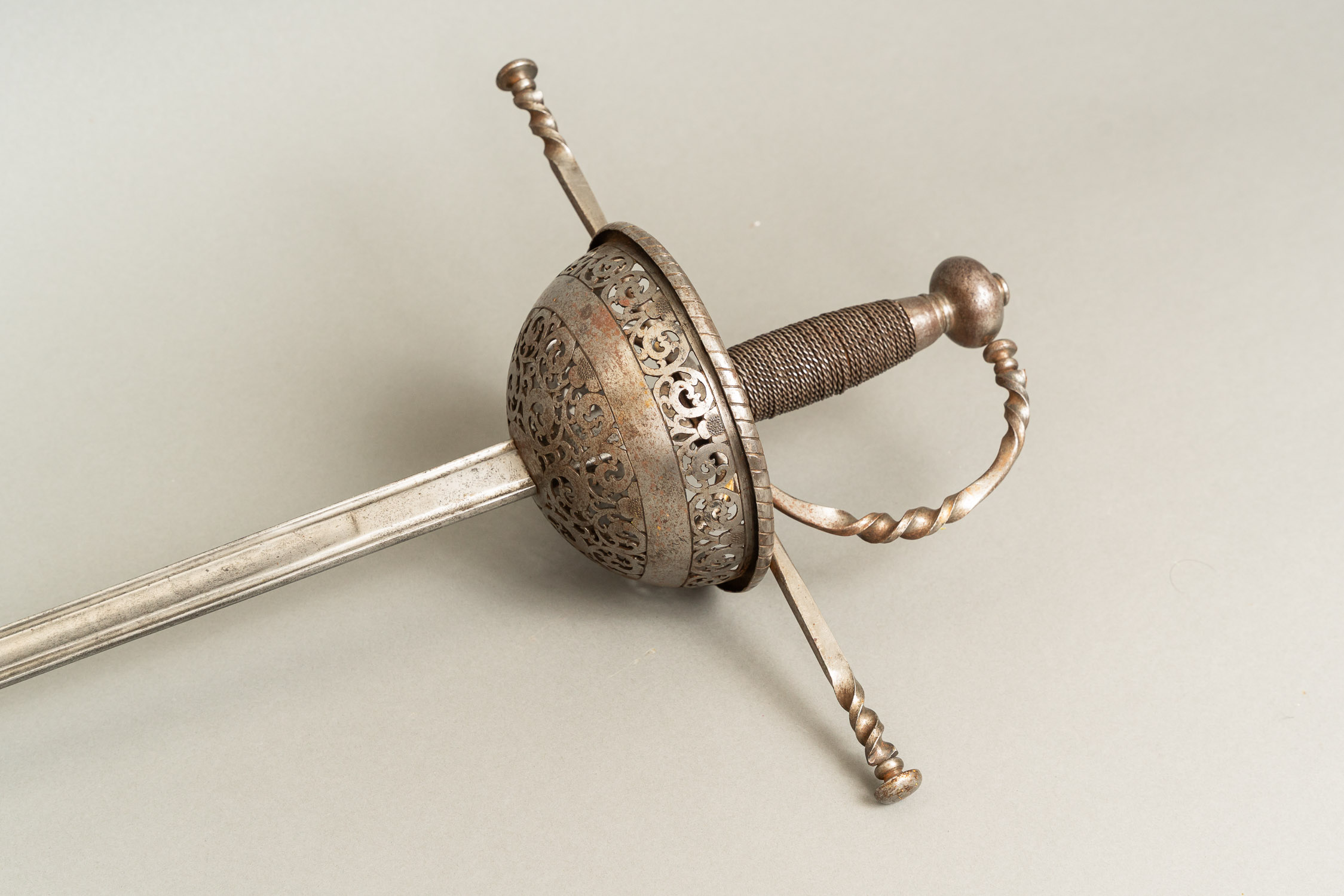 Spanish Long Sword, polished and fluted blade. Open work. Iron. Hand protection round turned cross and grip bow. Iron handgrip with finial bowl. 17Th Century. 110 cm long.