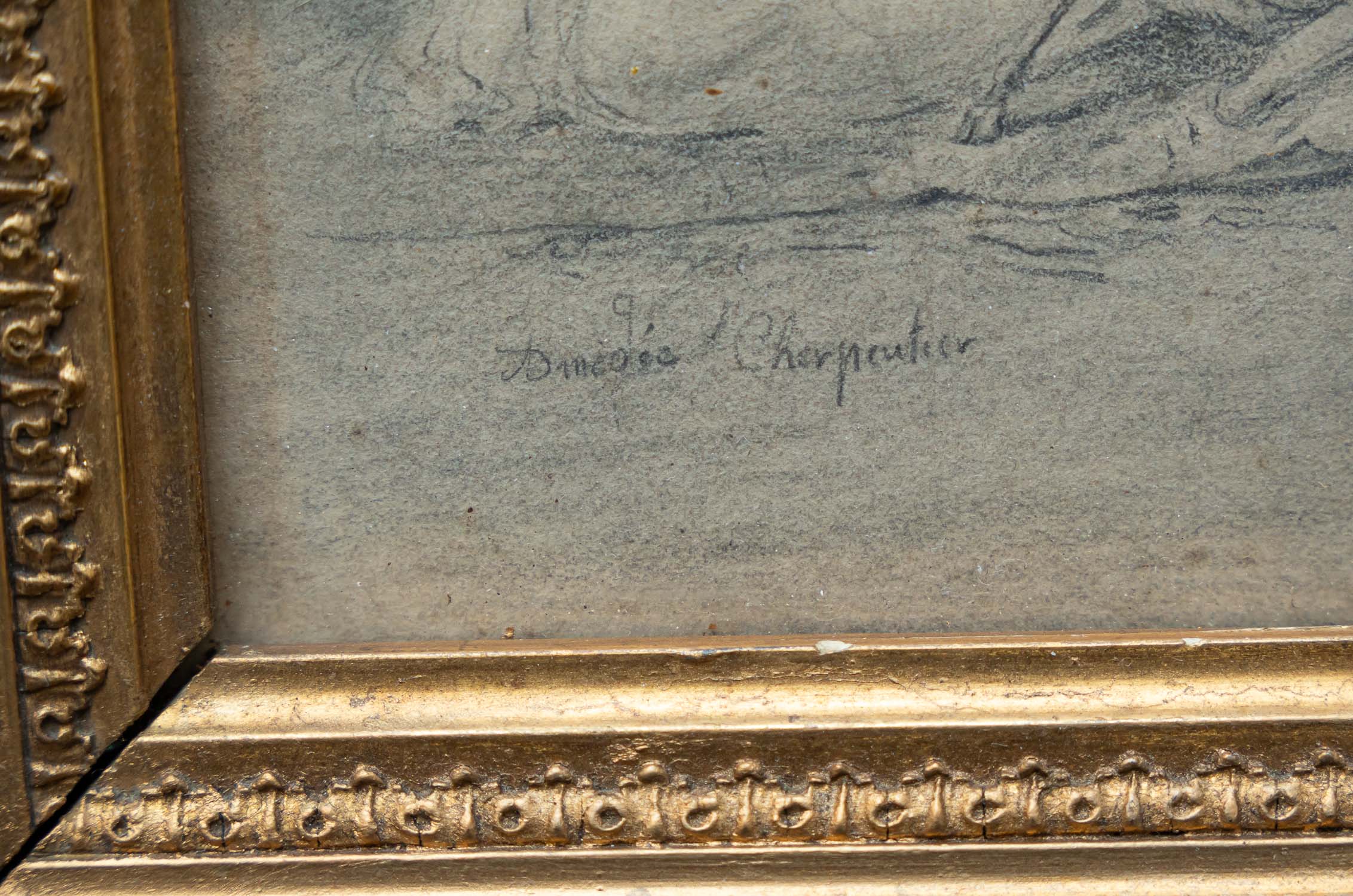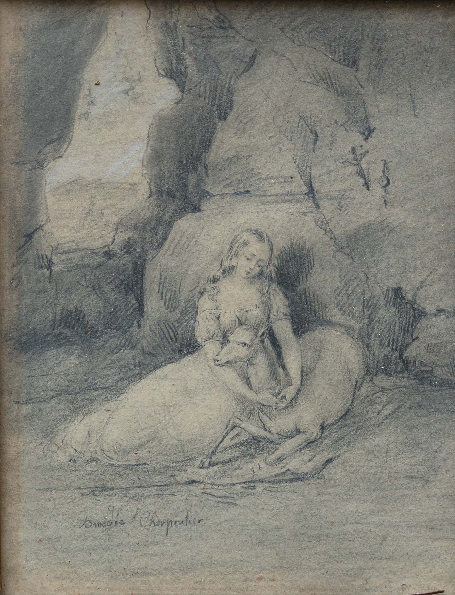 Andrei Amedee Charpentier- Bosio ( 1822-1884), Girl with goat . Black chalk on paper. Signed. Framed. 18 x 14 cm