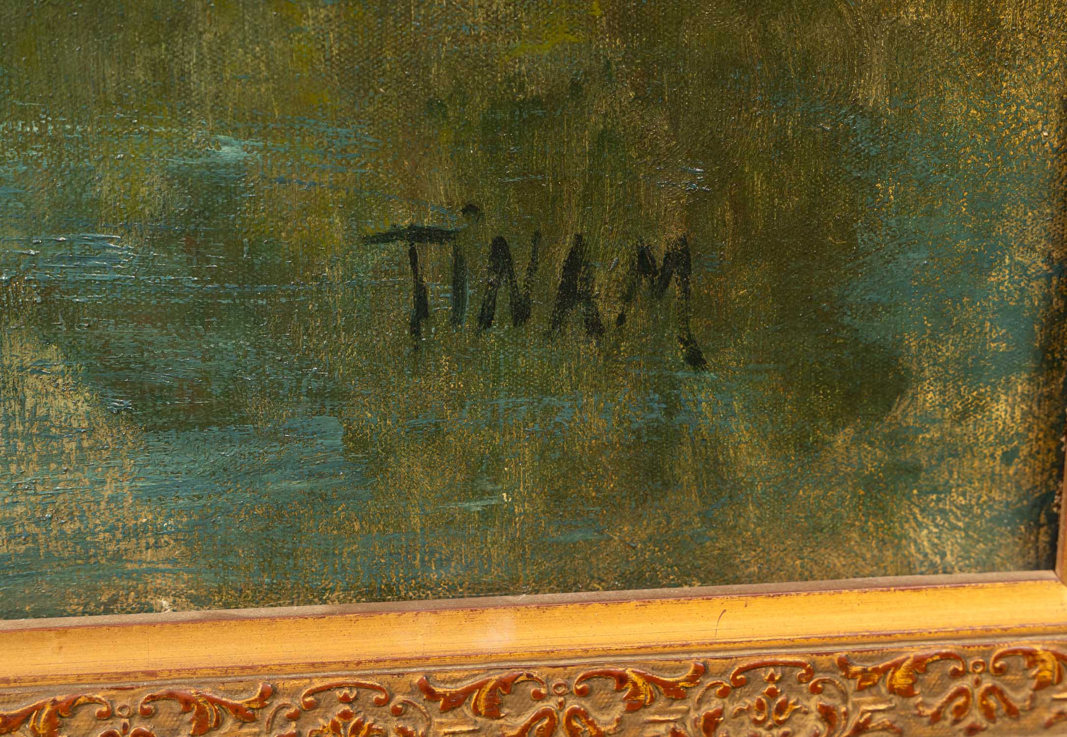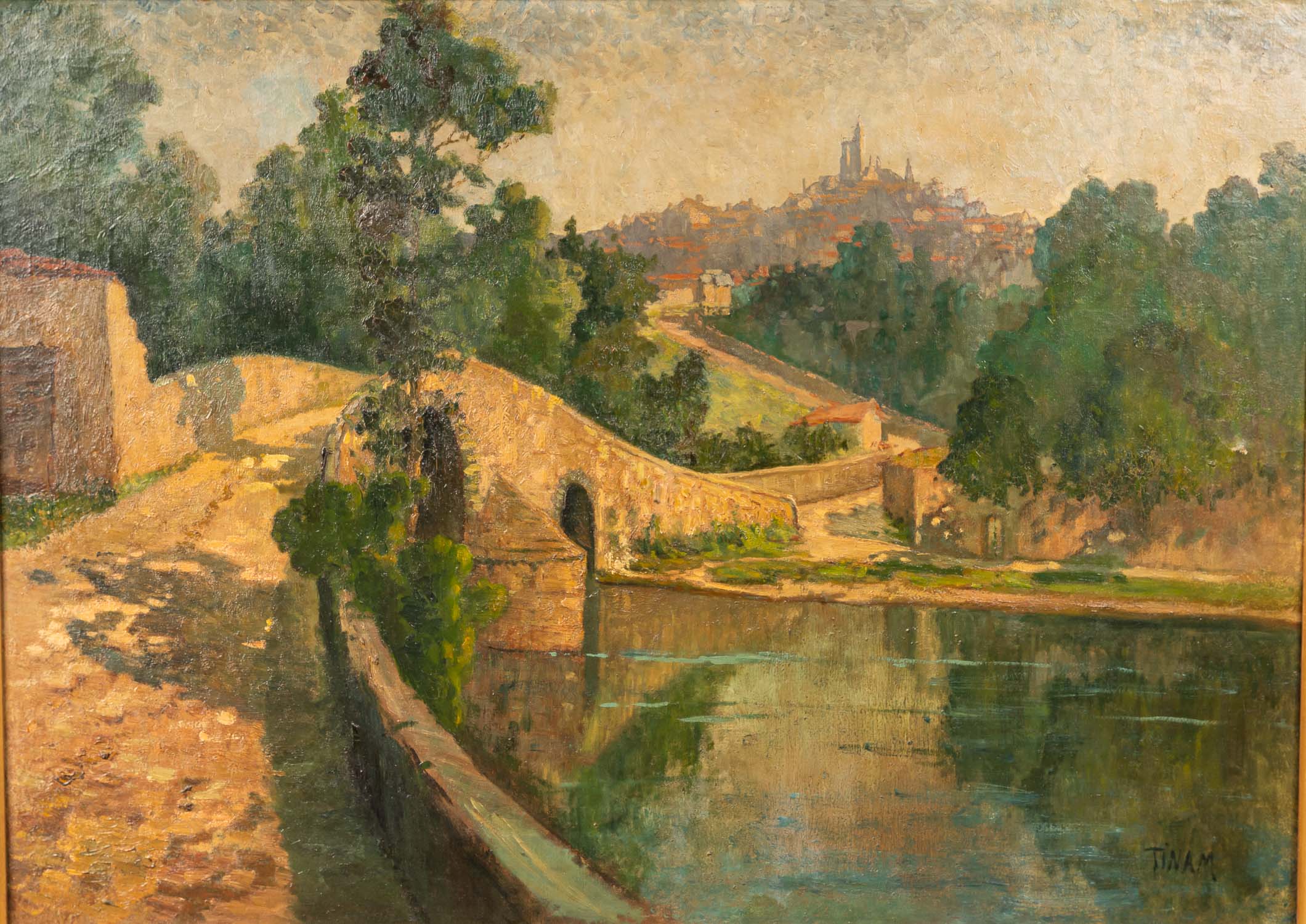 School of Barbizon , large painting of a french town by a river. Oil on canvas. Signed Tinam . Framed. 90 x 130 cm
