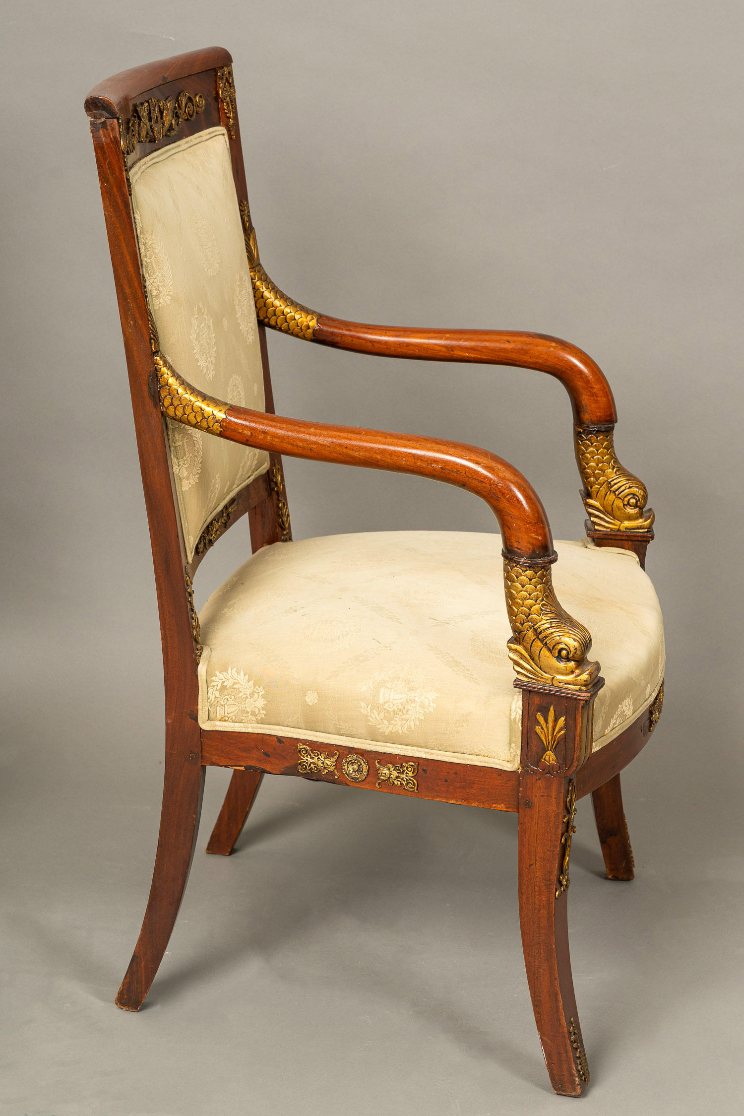 Pair of Classical Armchairs, in french empire character. Mahagony. Partly gilded and with gilded bronze mounts. Later green tapestry. A pair, 90,5 x 58 cm. Sitting high 40 cm. 19Th Century.
