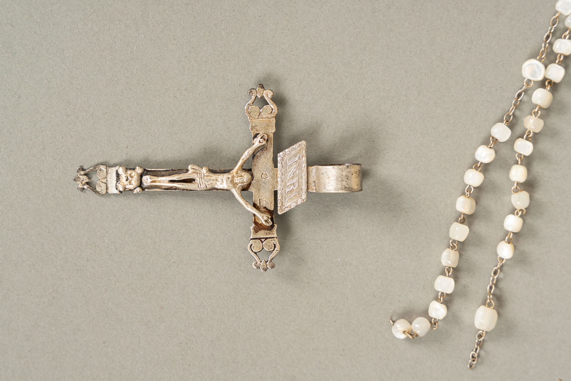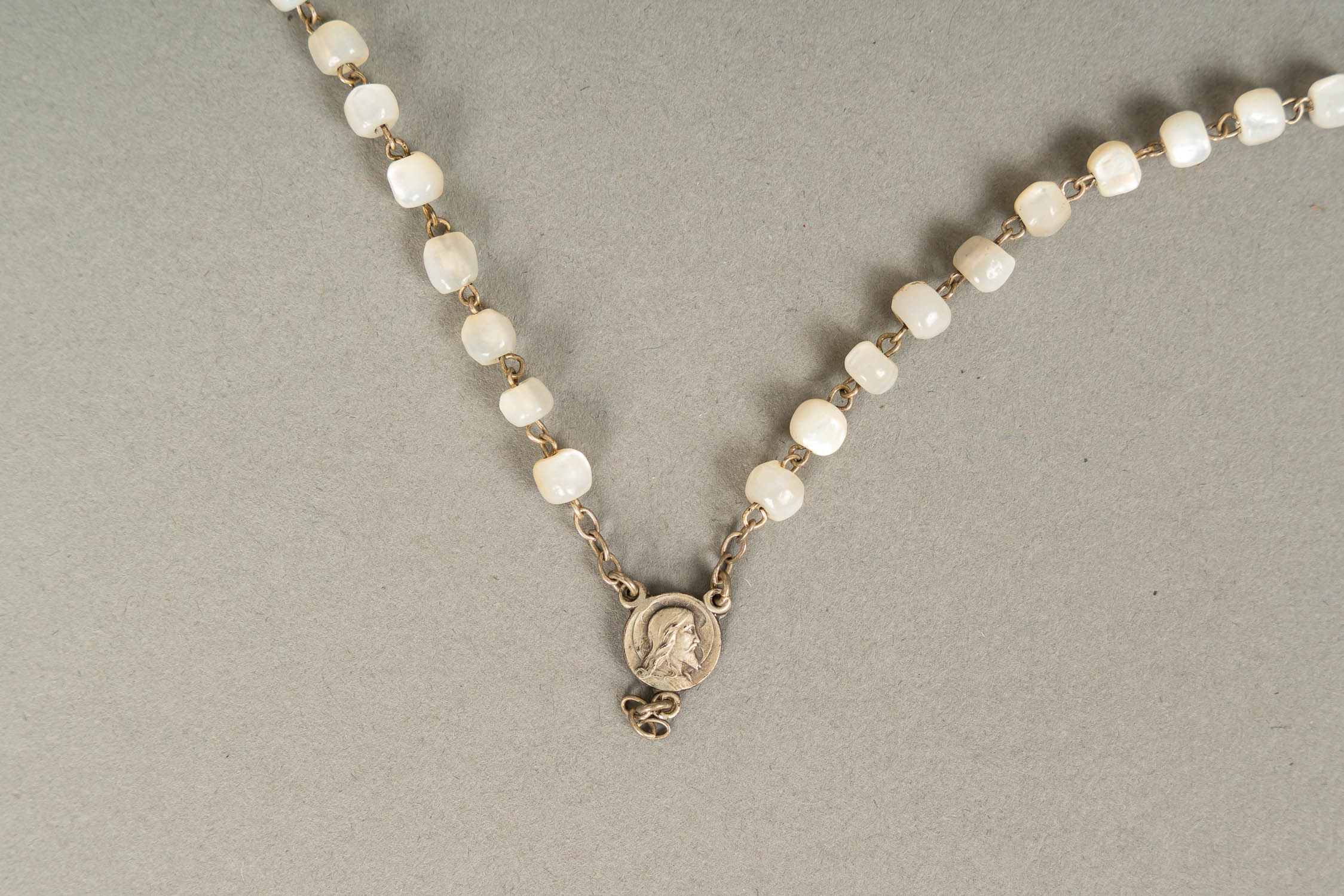 Rosary, with mother of pearl, chain, silver Cross in box by Cave Rue Saint Honoree, Paris. 19Th Century.