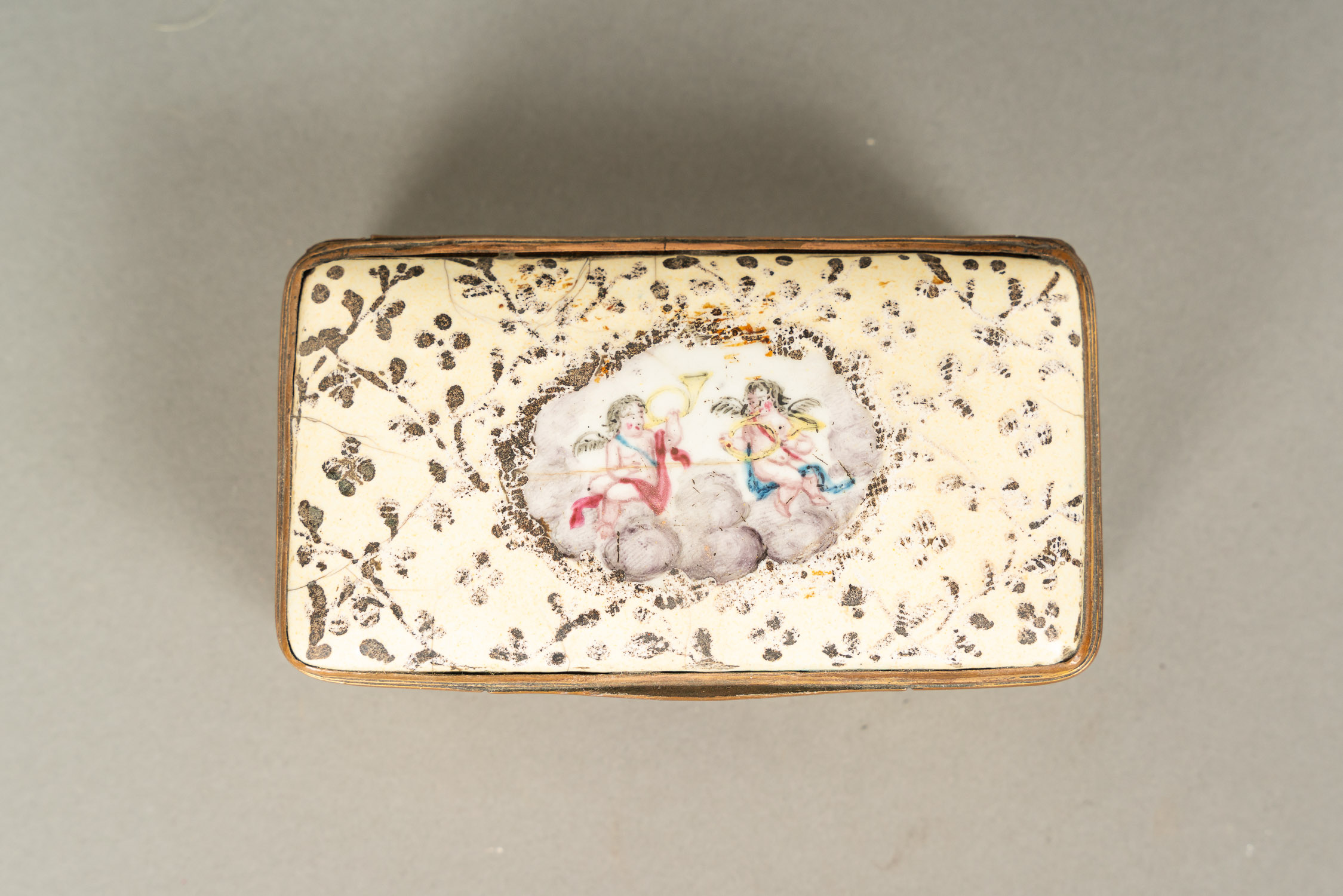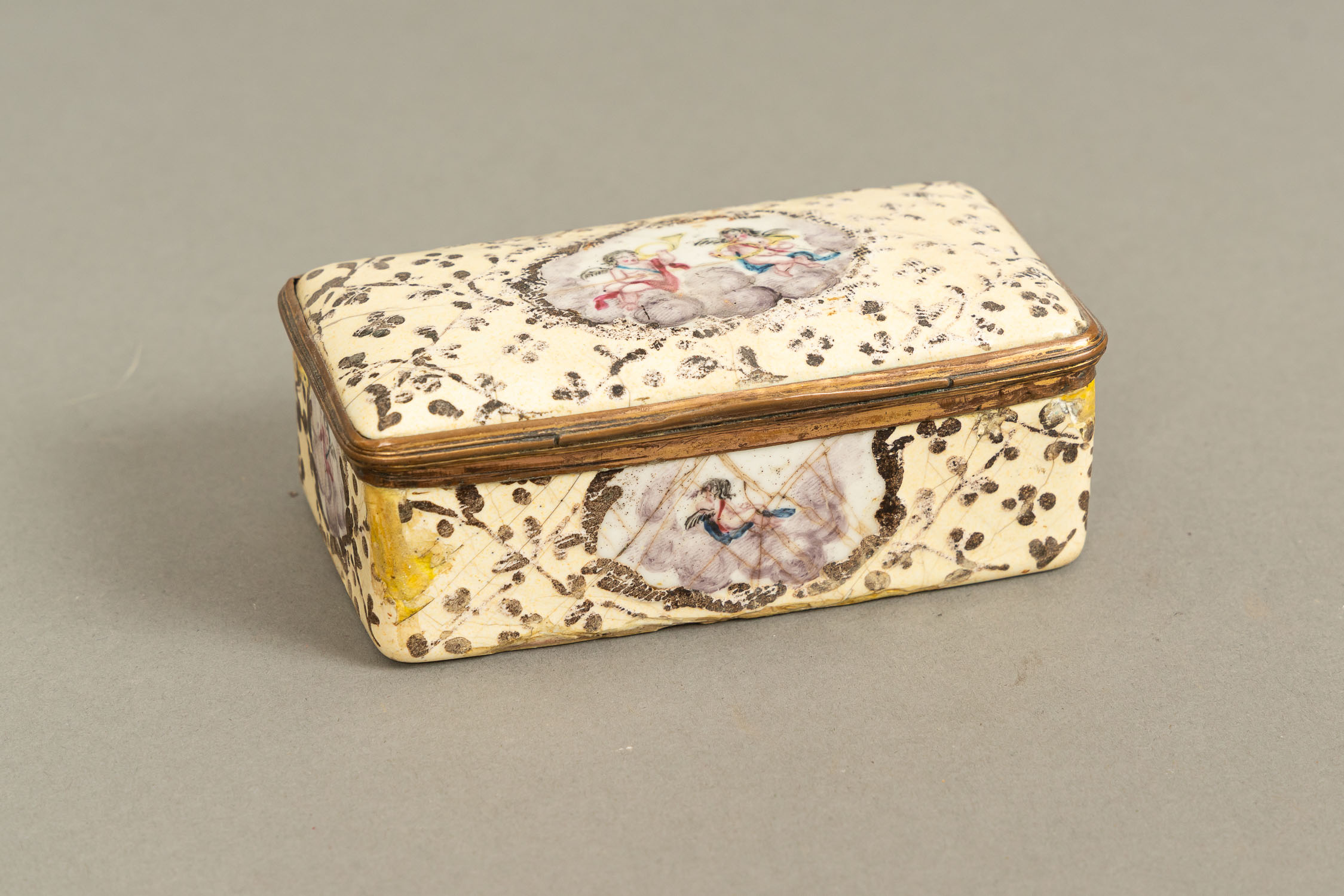 German Enamel Box, rectangular with lid. Copper partly gilded. Rich multicolour enamel paint. German 18th Century. 10 x 5,5 x 4 cm.
