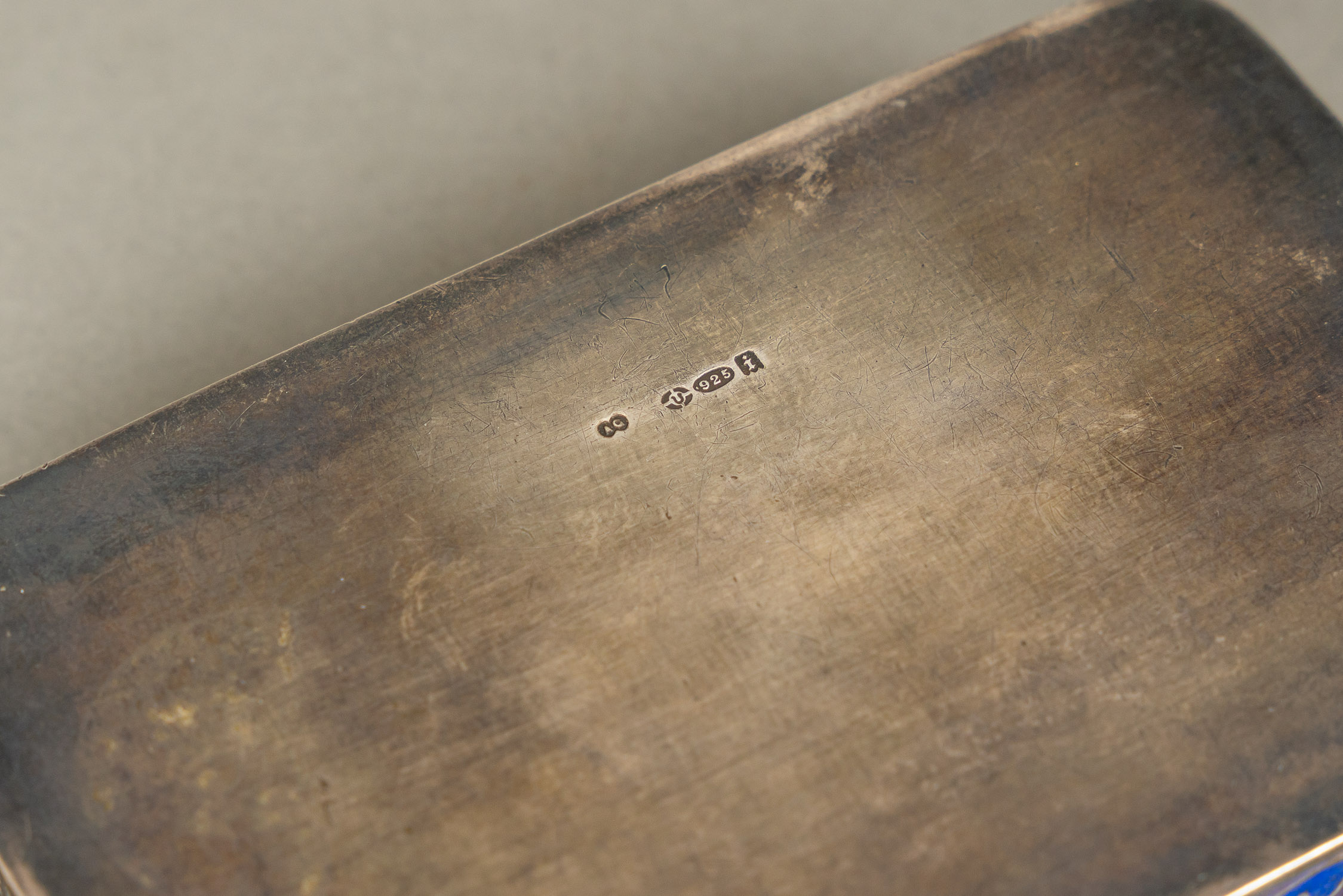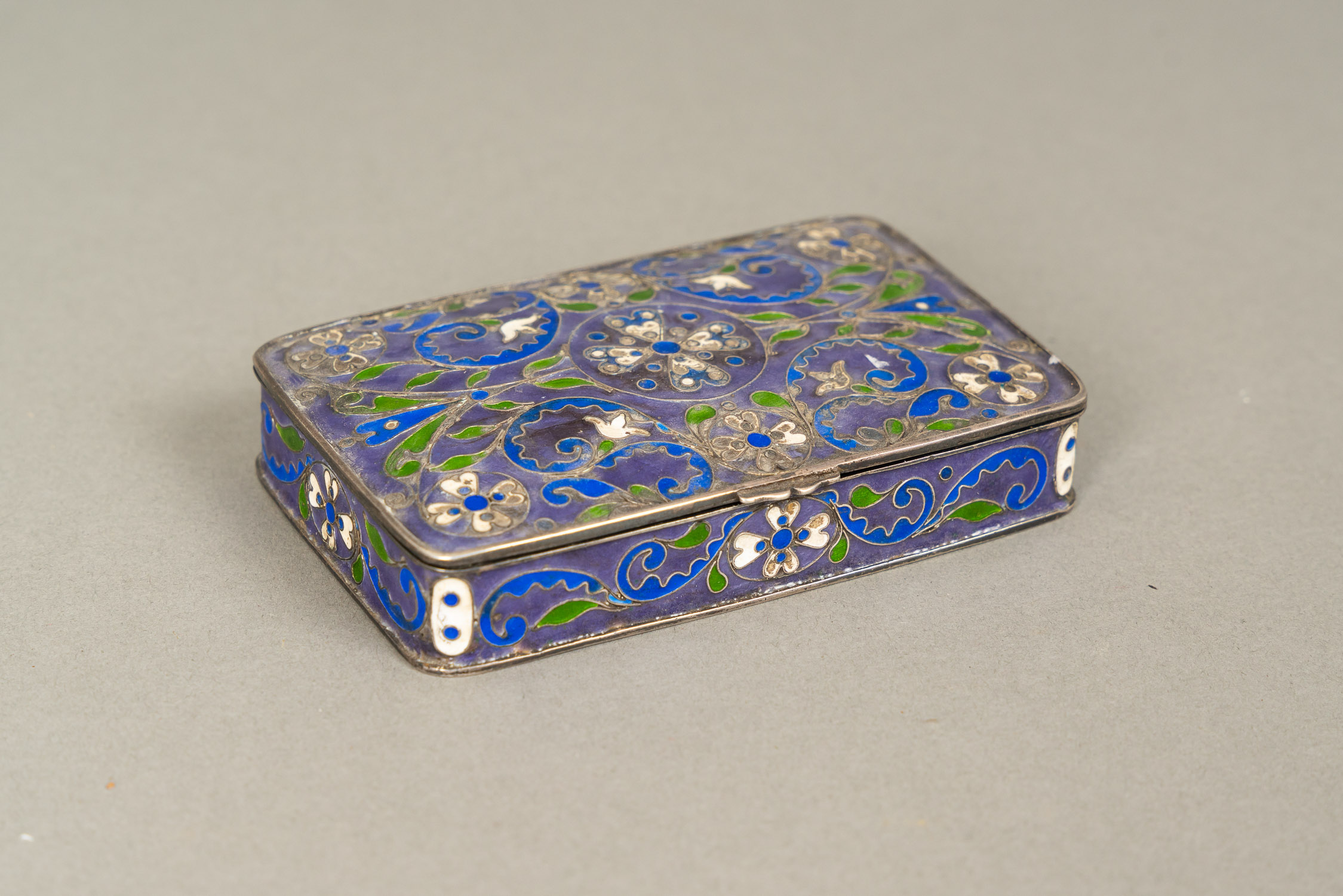 Snuff Box, rectangular shape with lid. Silver with rich multiculoured enamel decorations. Hallmarked inside dated 1933 and gilded. Possibly eastern Europe early 20th Century. 96 gramm. 9 x 5,5 x 1,8 cm.