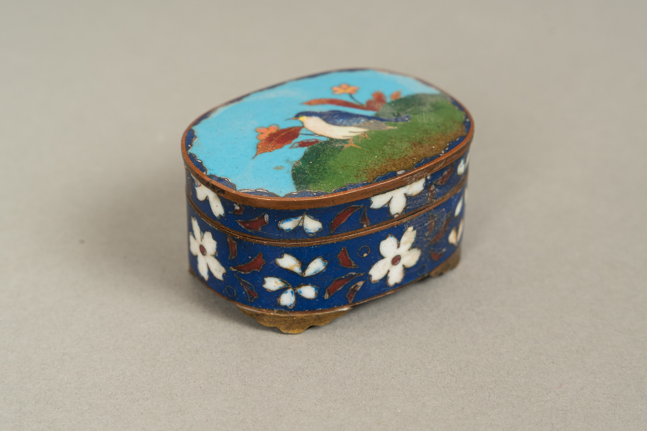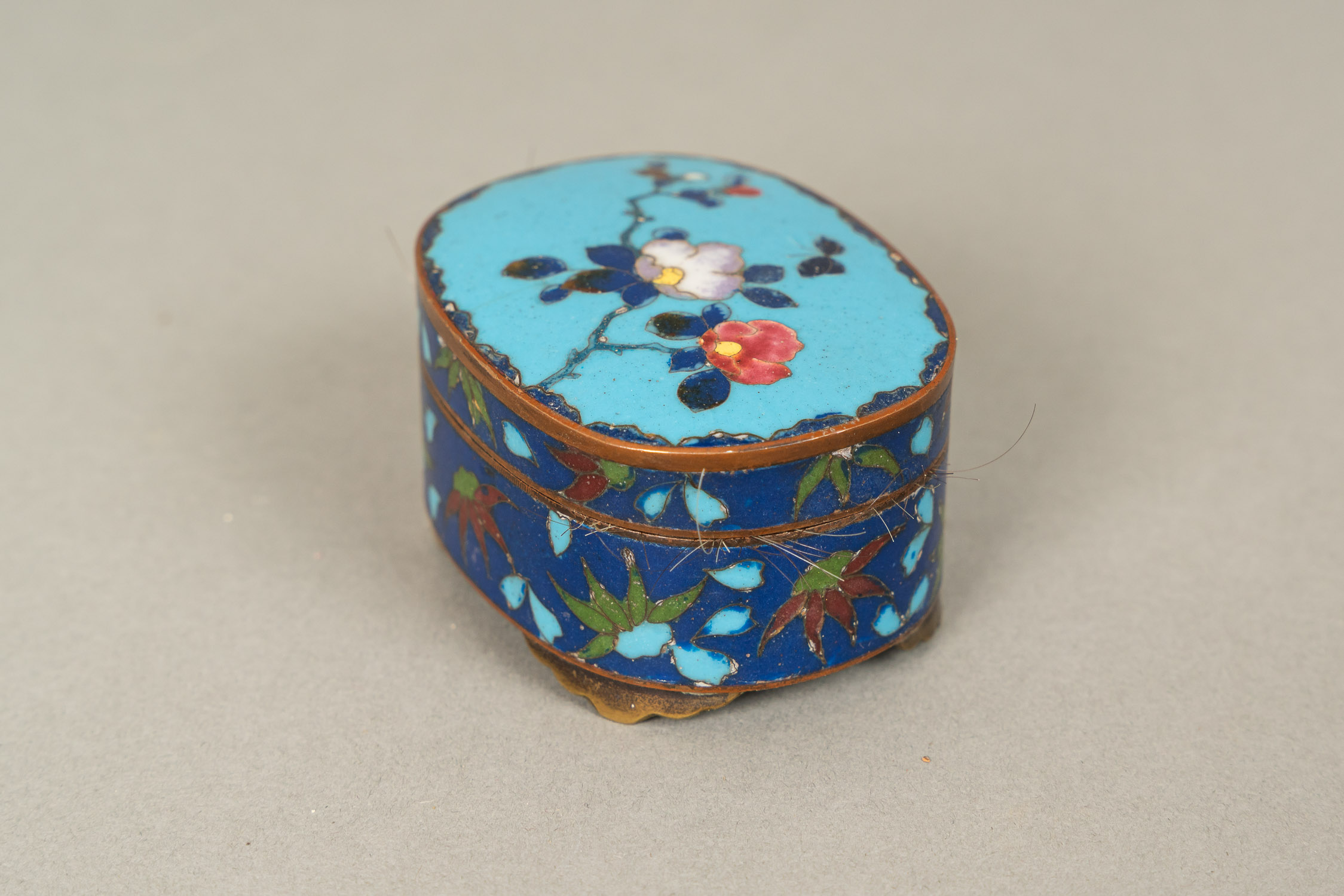Two Chinese Cloisone Boxes, oval shape with lid and feet. Multicoloured enamel with flowers and birds. A pair, 19th Century. 6 x 4,5 x 3 A pair.