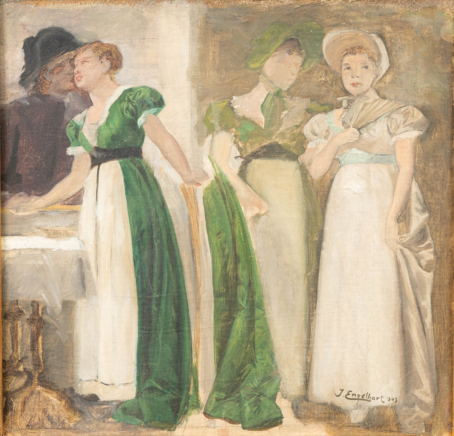 Josef Engelhart ( 1864 – 1941 ) - attributed, Oil Study with girls . Oil on canvas on board. Signed and dated bottom right. Framed. 31 x 32 cm
