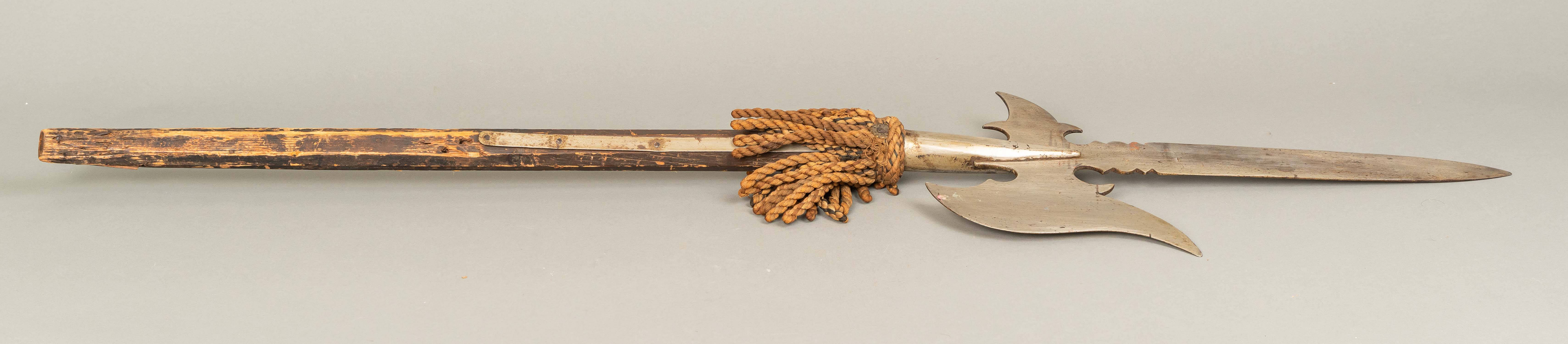 DEUTSCH AUCTIONEERS Lot101 in DetailHalberd, polished steel with original master sign, cross. On wooden shaft. Broken. With later textile decoration. Austrian or German 15/16th Century. Total lenght 114 cm, metal 52 cm long.