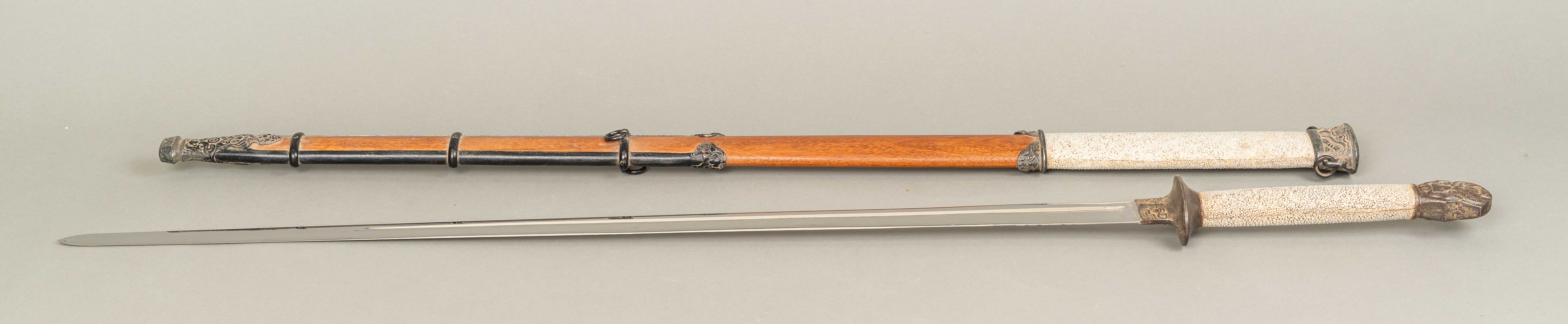 DEUTSCH AUCTIONEERS Lot105 in DetailChinese Sword, polished and fluted blade. Decorated handgrip with shark skin. In wooden shaft with decoration mounts. Lenght 105 cm.