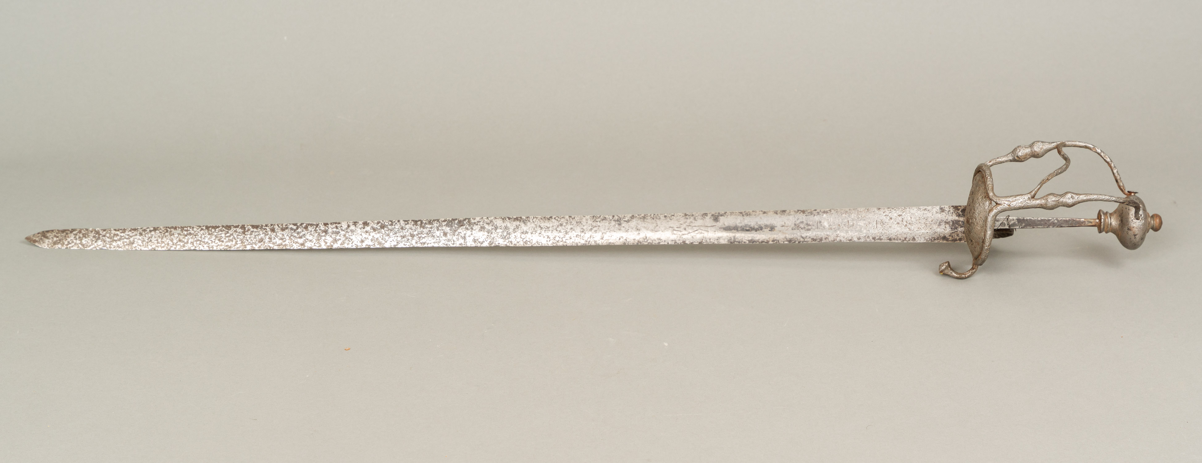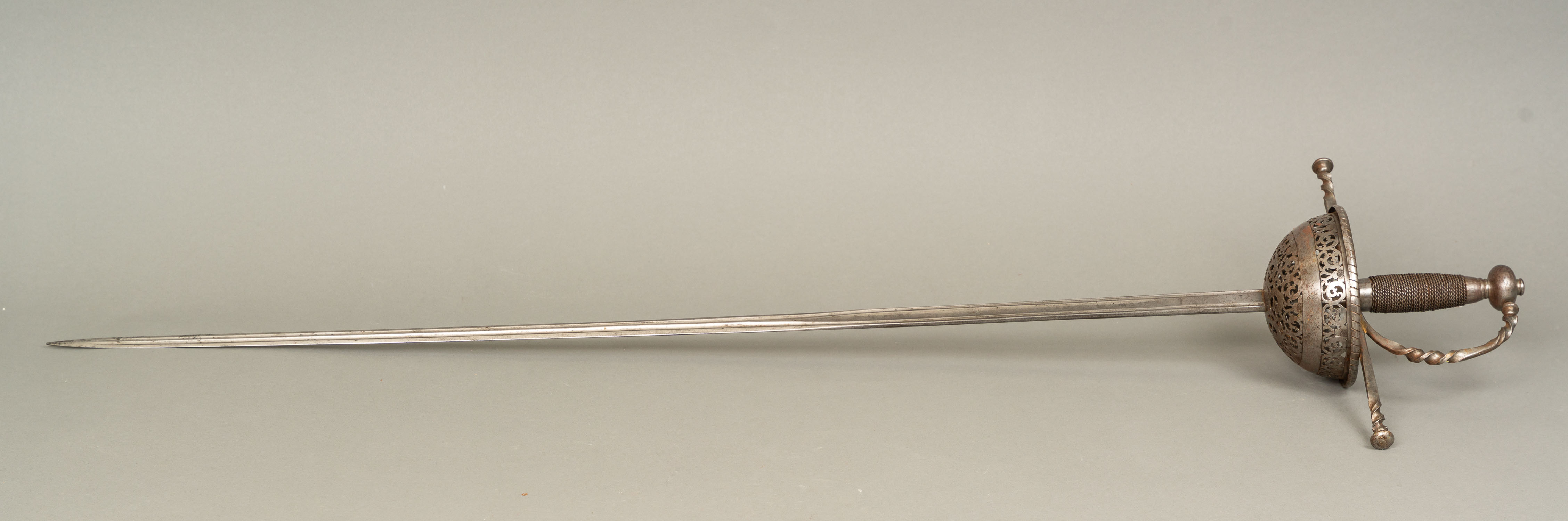 DEUTSCH AUCTIONEERS Lot111 in DetailSpanish Long Sword, polished and fluted blade. Open work. Iron. Hand protection round turned cross and grip bow. Iron handgrip with finial bowl. 17Th Century. 110 cm long.