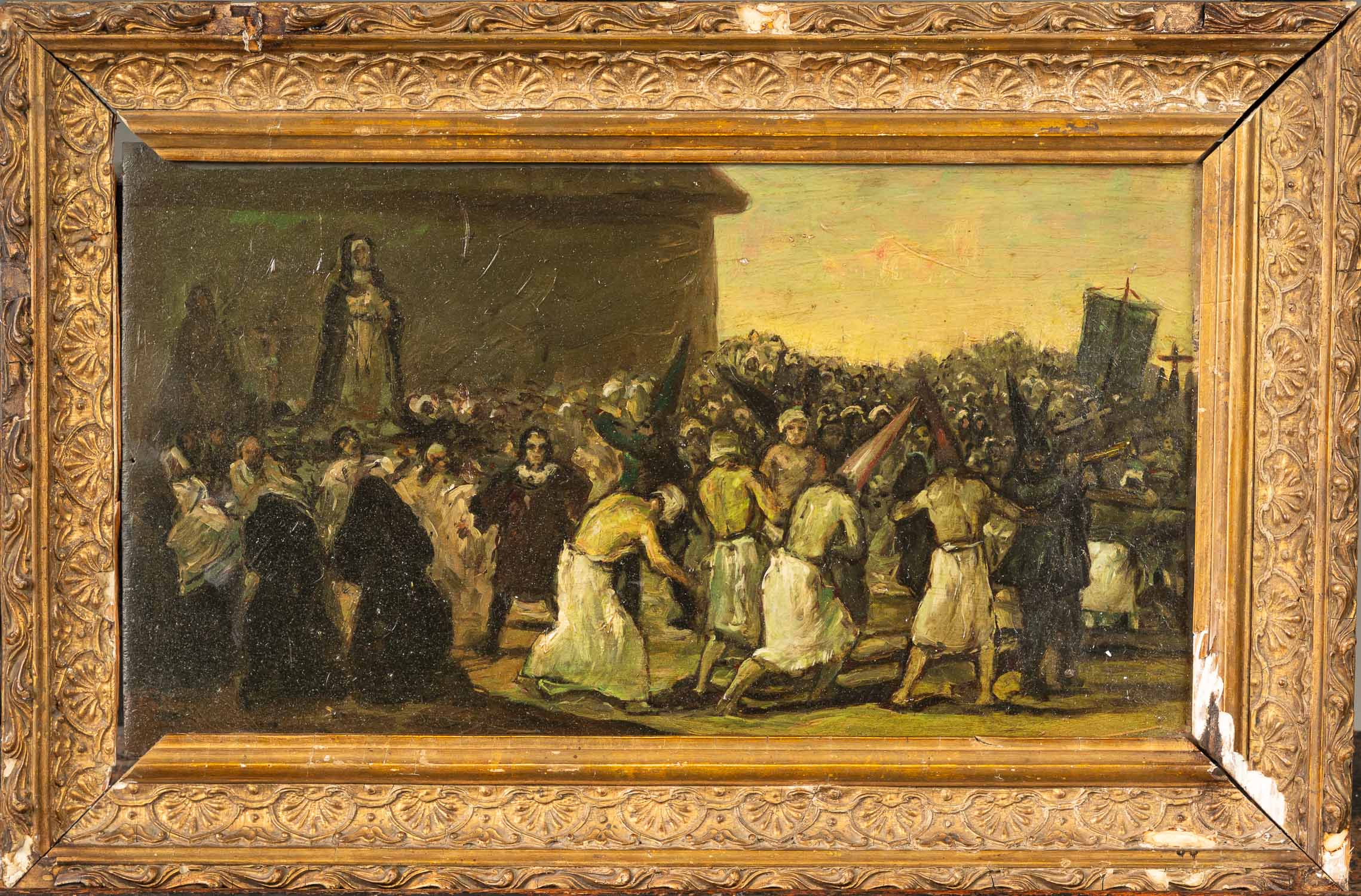 DEUTSCH AUCTIONEERS Lot110 in DetailSpanish School early 19th Century, Autodafe . Oil on wooden panel. Framed. 20 x 36 cm