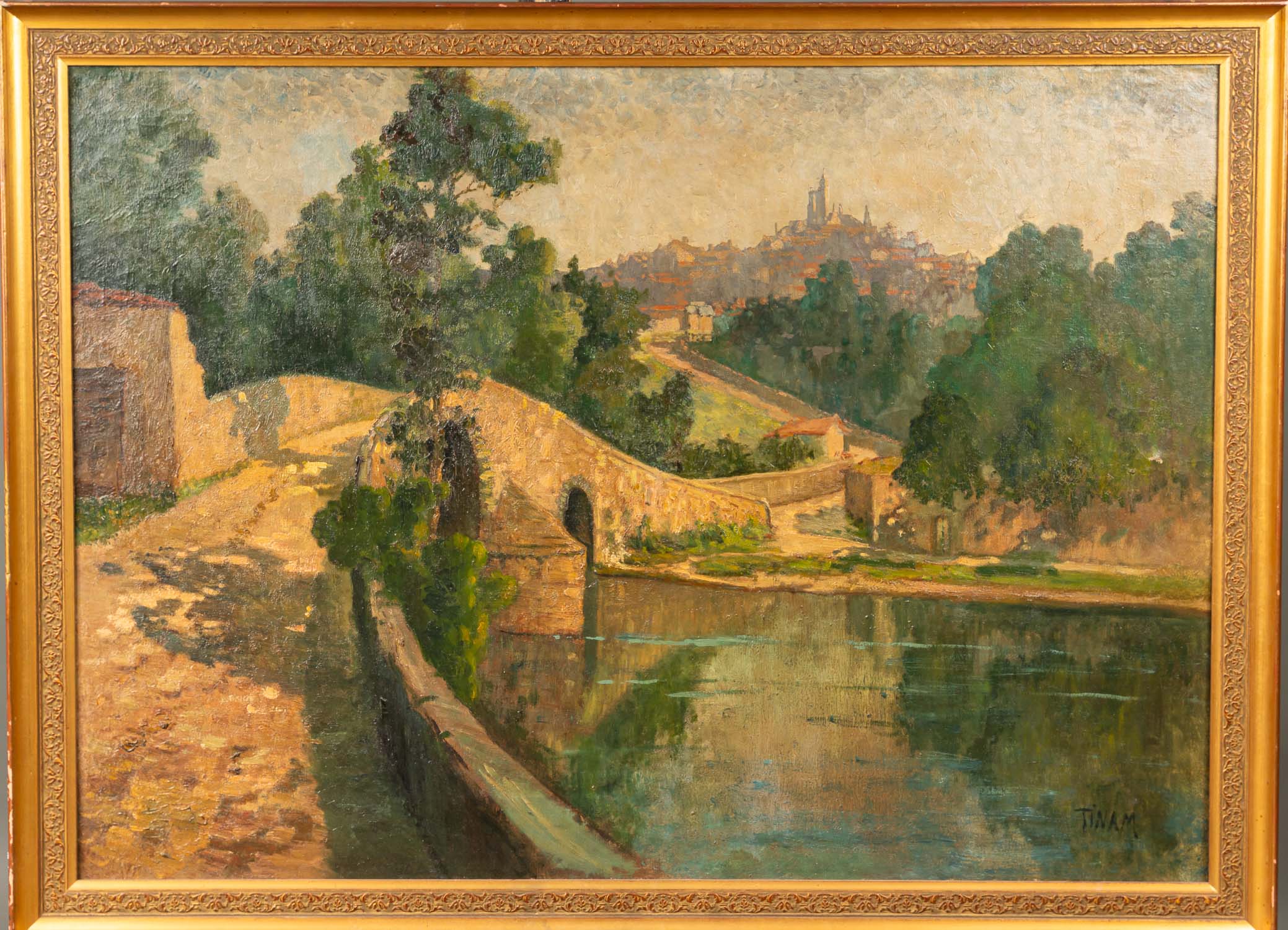 DEUTSCH AUCTIONEERS Lot116 in DetailSchool of Barbizon , large painting of a french town by a river. Oil on canvas. Signed Tinam . Framed. 90 x 130 cm