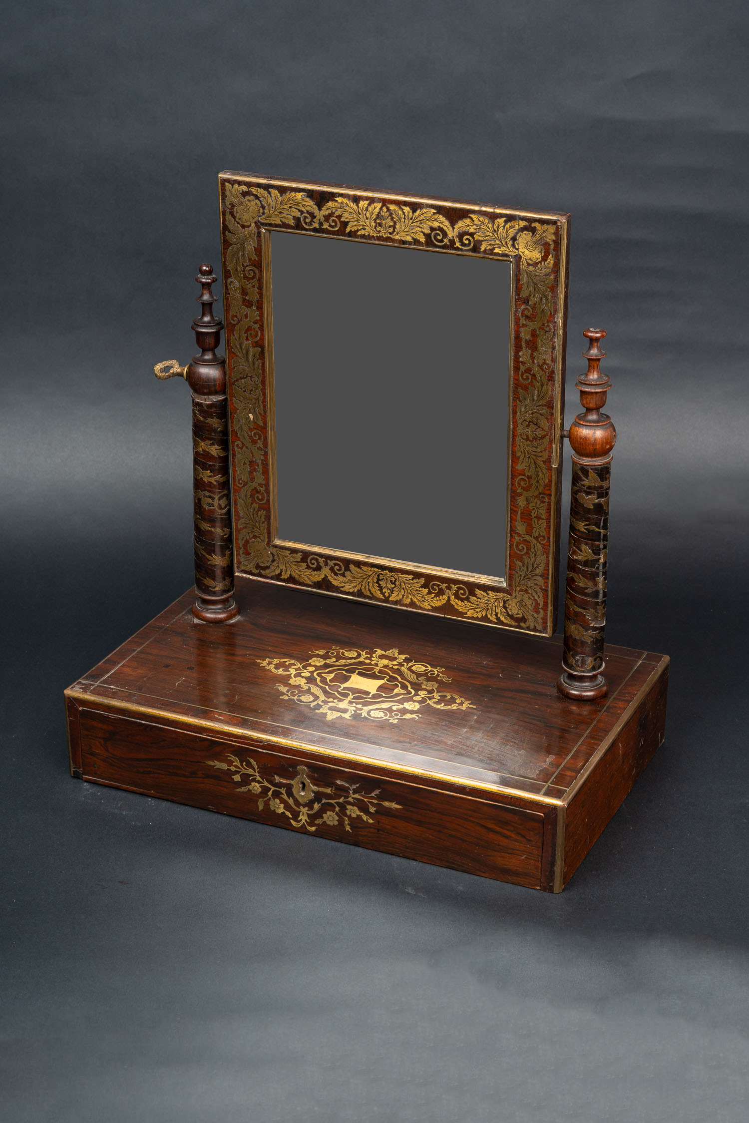 DEUTSCH AUCTIONEERS Lot118 in DetailCharles X Travel Mirror, rectangular and adjustable on two collums on base with drawer , rosewood on hardwood with rich floral bronze intrarsias , damages. Mid of 19th Century. 45 x 40 cm