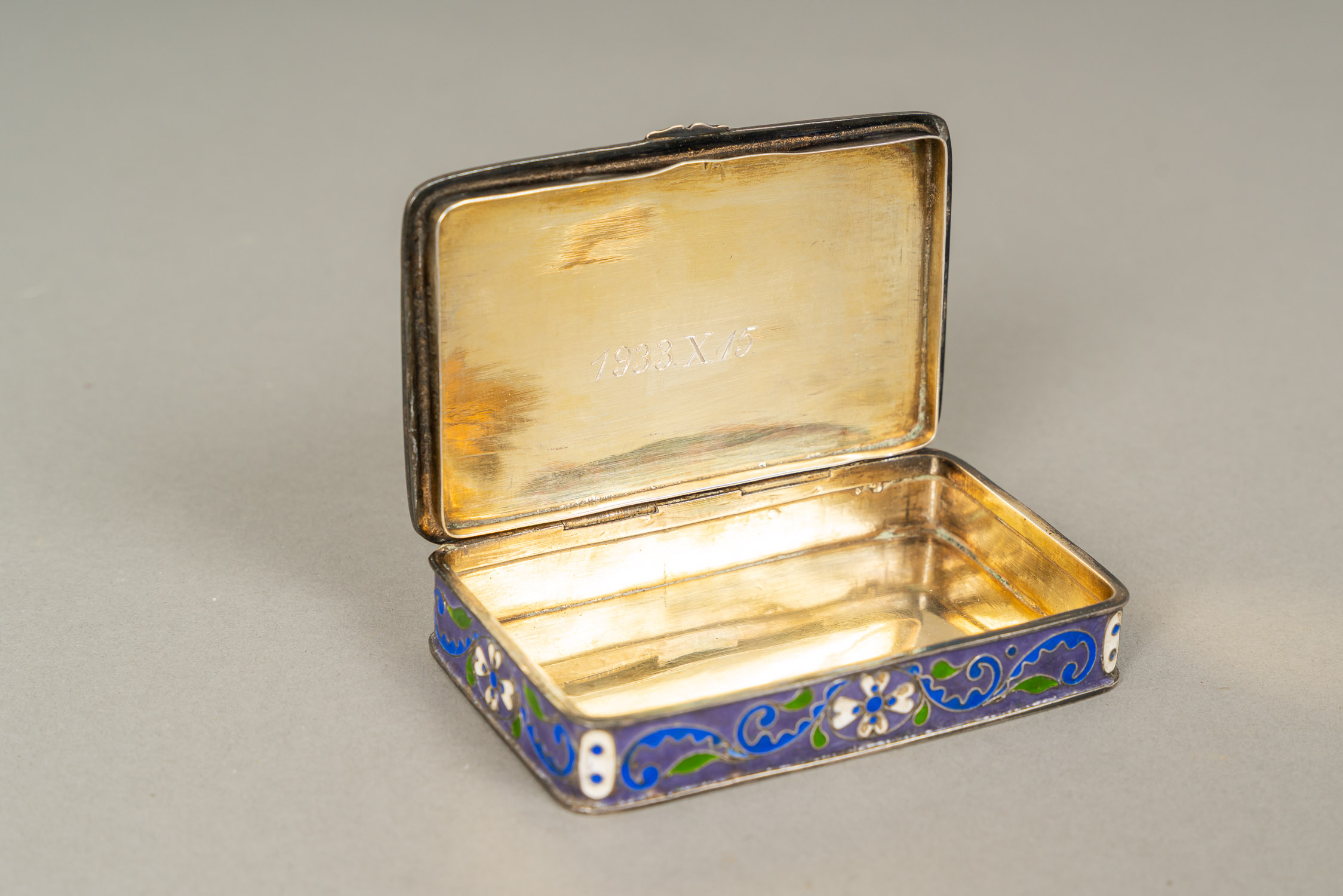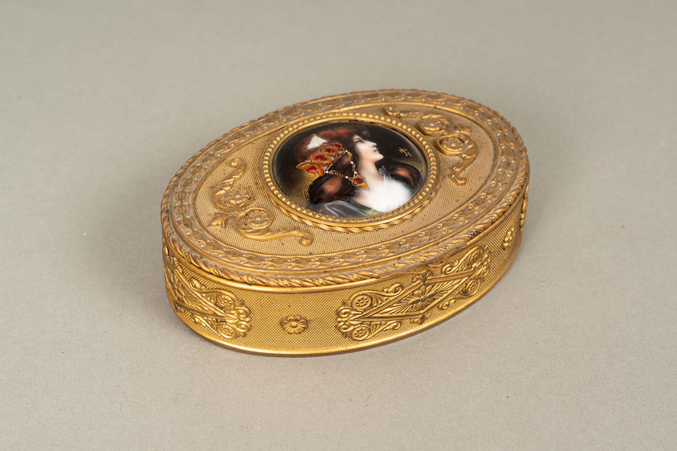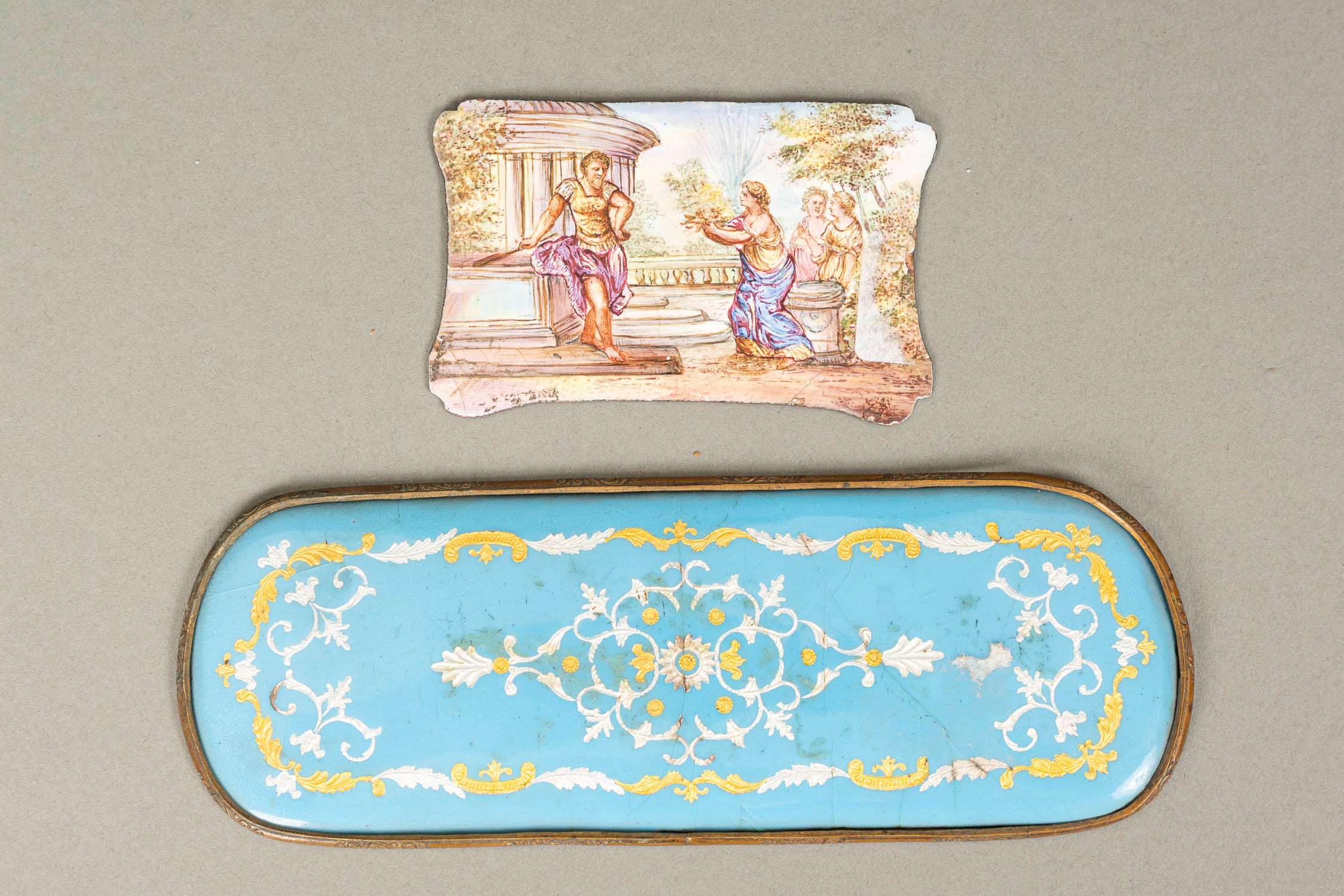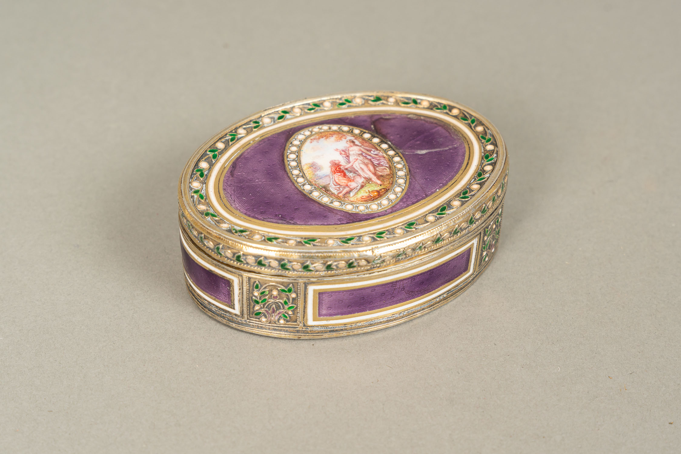 Large French Gold Snuff Box, oval shape with lid. Inside 18 Carat gold and with two hallmarks on the border. The inner lid gold plated. Decorated with gold and silver and gold plated ornamental and floral decorations. Two gold colours. Possibly two hallmarkson the outer side and lid. Green enamel leafs with white pearls. Six violet enamel fields. In the centre on top allegorical elegant enamel scene surrounded by white enamel pearls and gold boarder. Possibly Paris around 1770. Damages. 223 gramm. 8,2 x 6,5 x 2,8 cm.