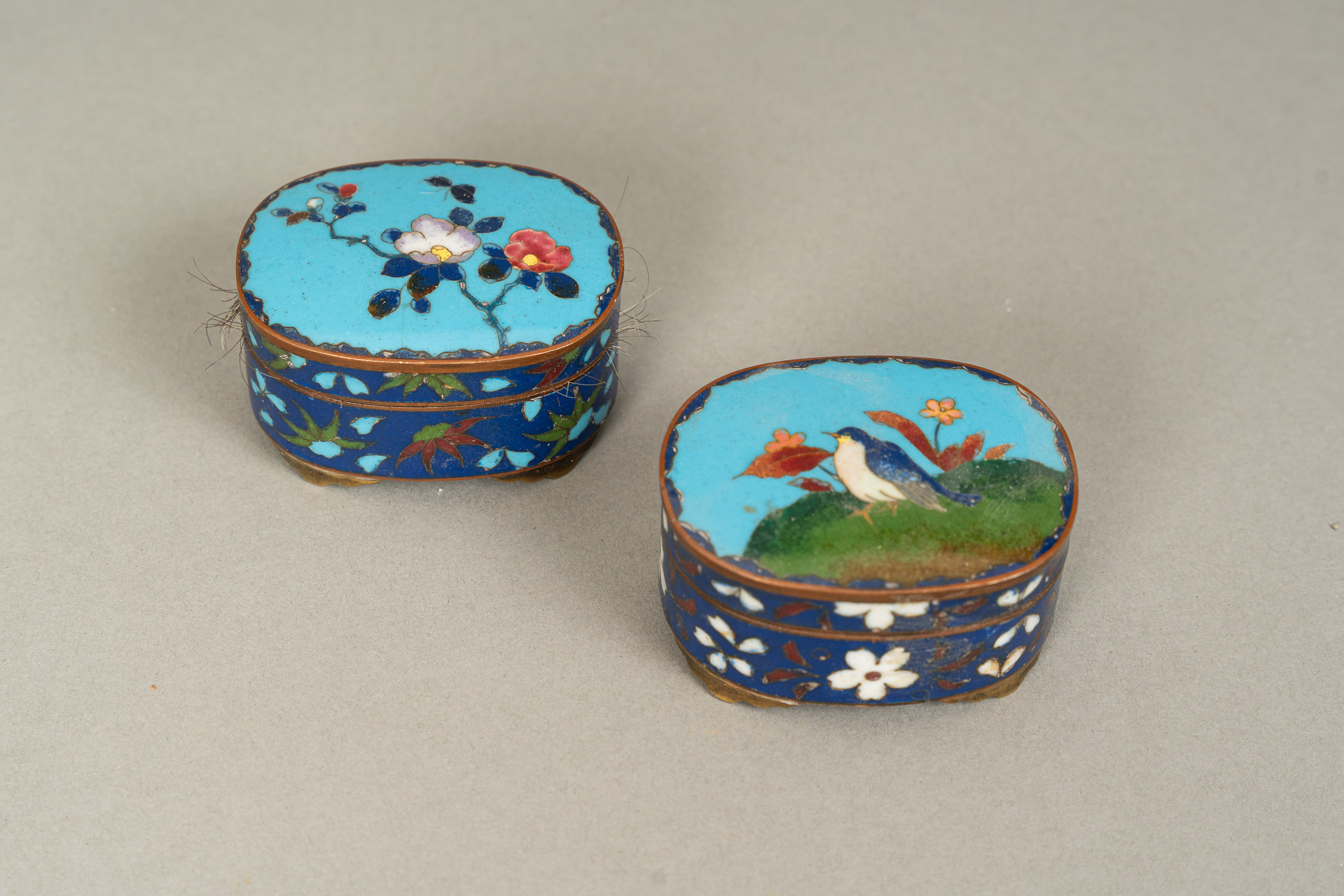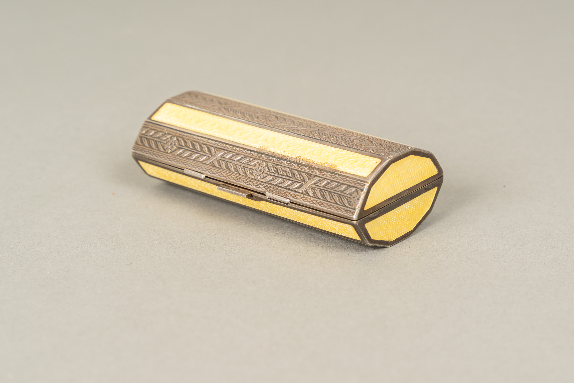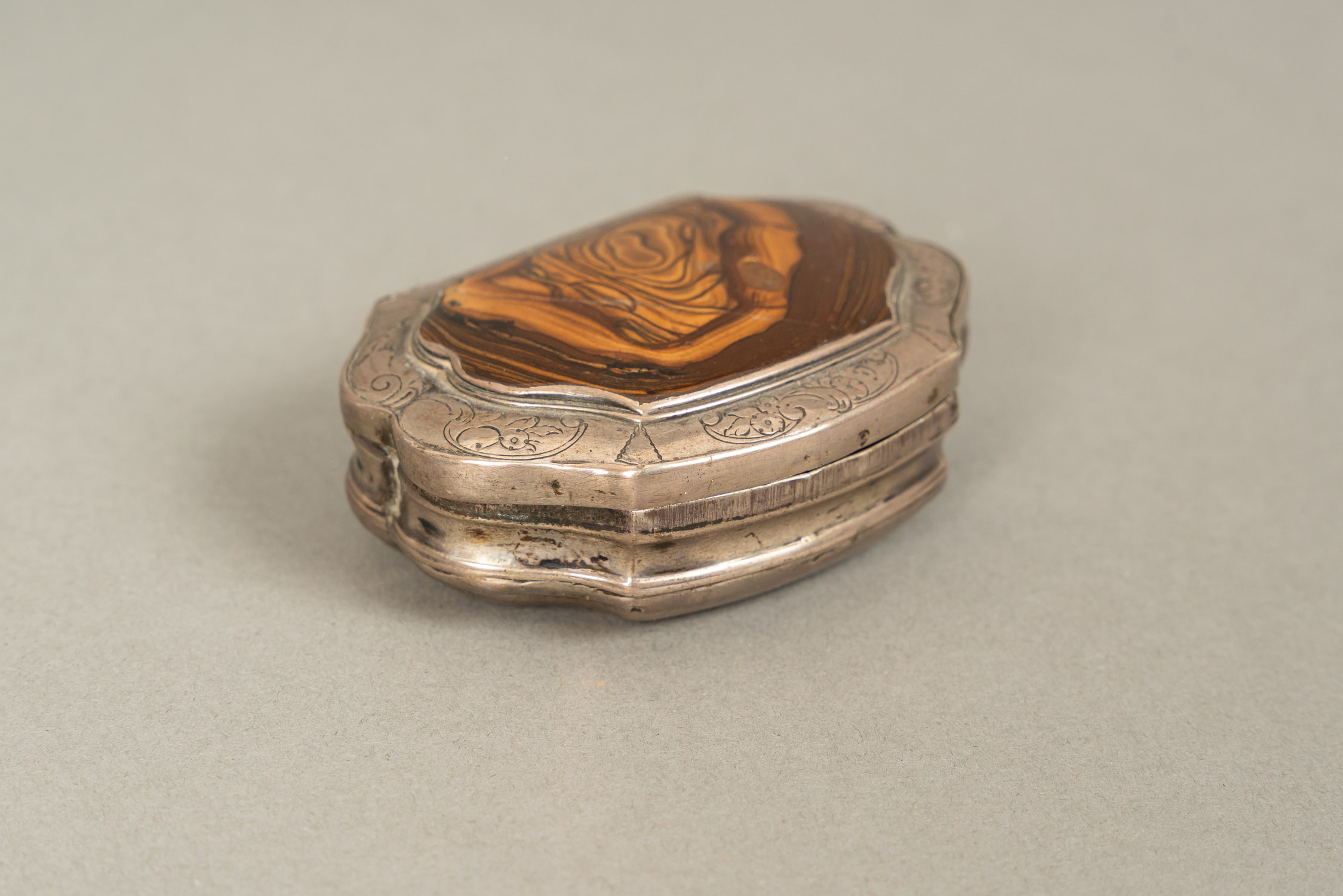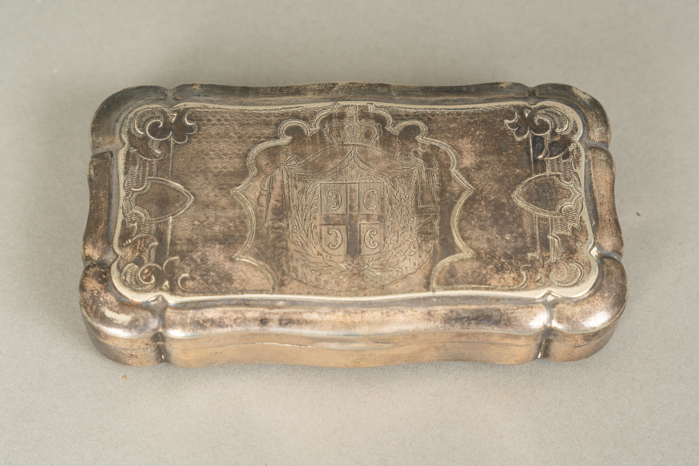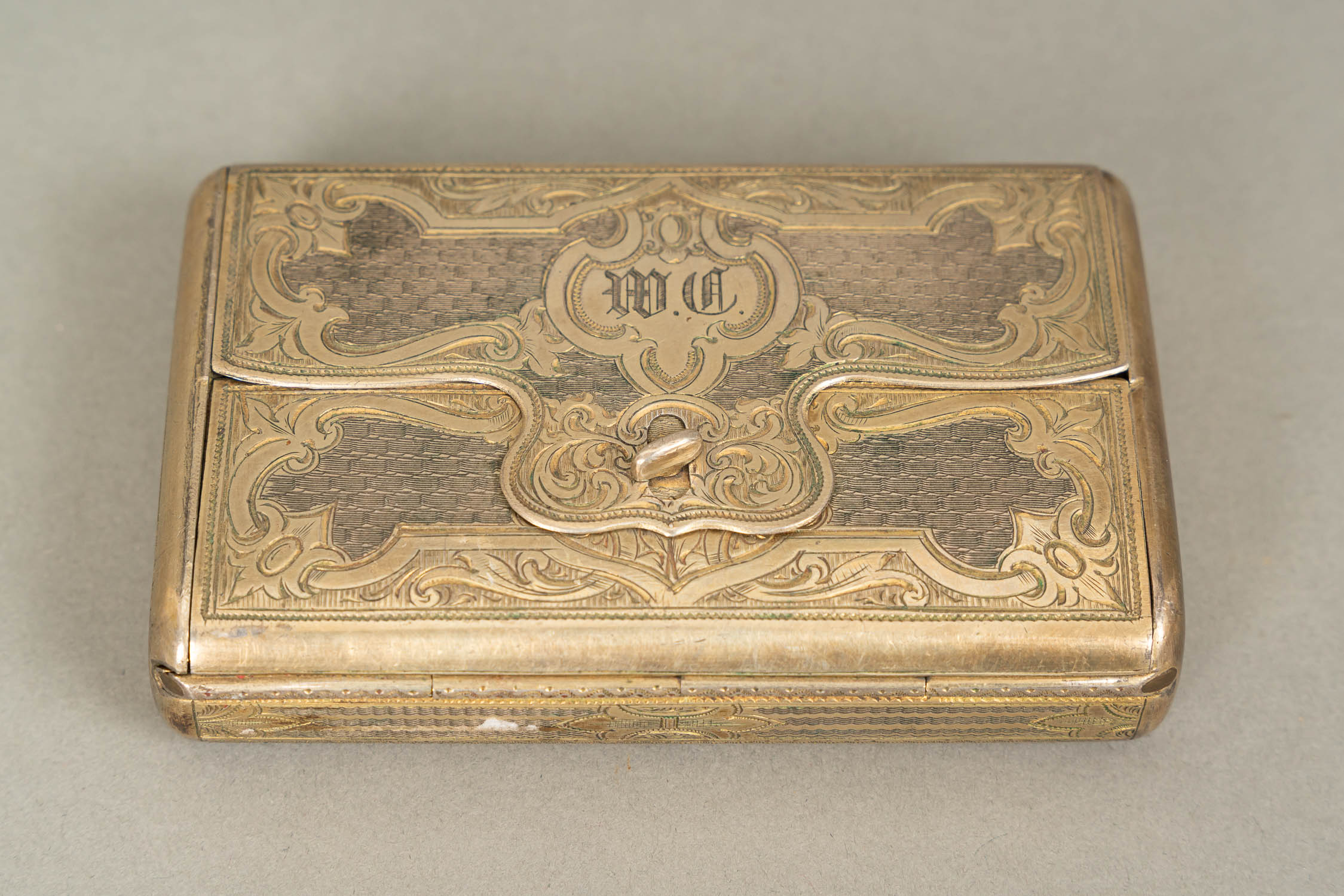 Large French Gold Snuff Box, oval shape with lid. Inside 18 Carat gold and with two hallmarks on the border. The inner lid gold plated. Decorated with gold and silver and gold plated ornamental and floral decorations. Two gold colours. Possibly two hallmarkson the outer side and lid. Green enamel leafs with white pearls. Six violet enamel fields. In the centre on top allegorical elegant enamel scene surrounded by white enamel pearls and gold boarder. Possibly Paris around 1770. Damages. 223 gramm. 8,2 x 6,5 x 2,8 cm.