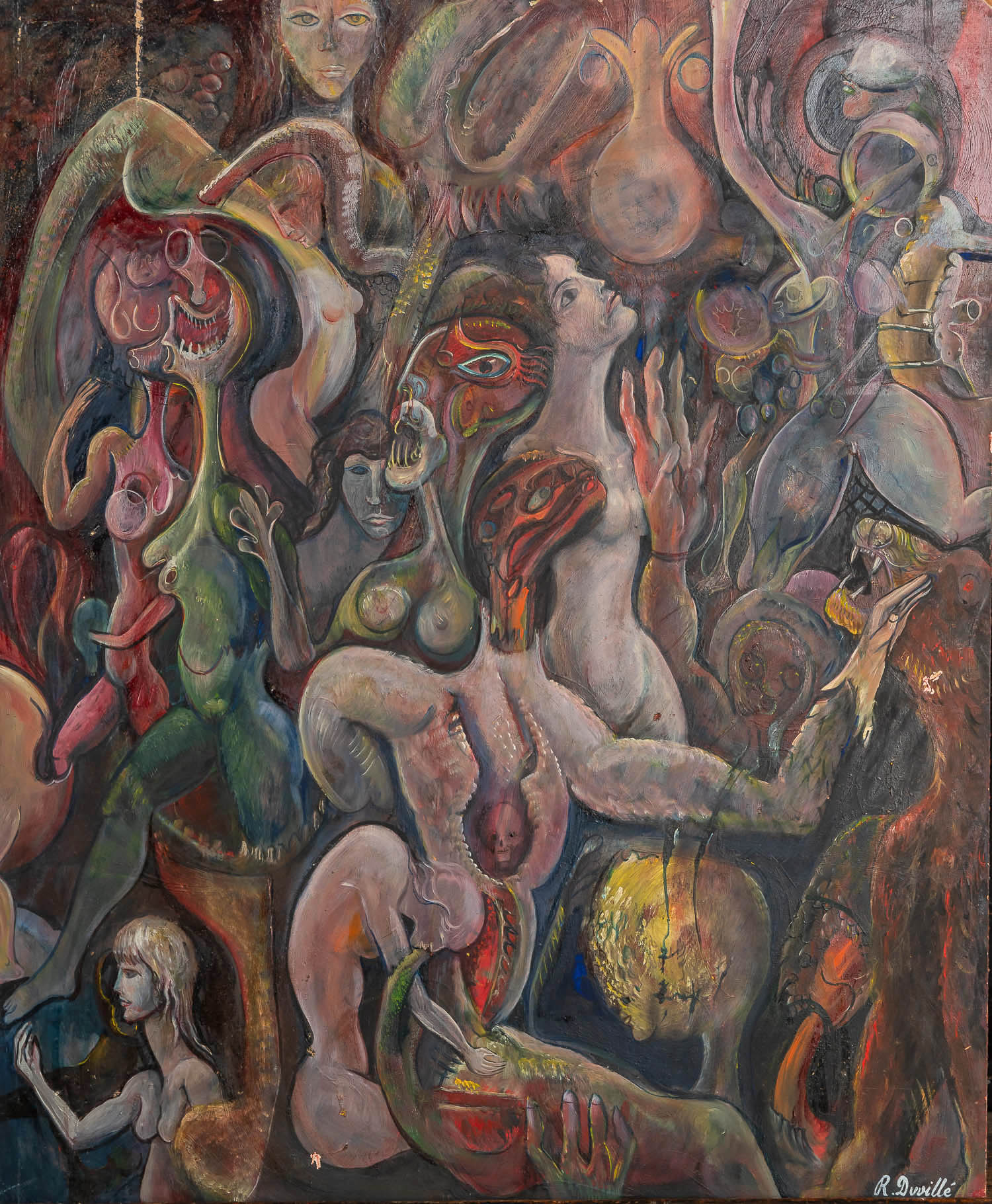 DEUTSCH AUCTIONEERS Lot262 in DetailRaymond Duville ( 1916-2007), Phantastic composition, signed bottom right and stamped on the reverse, oil on board . 60 x 50 cm