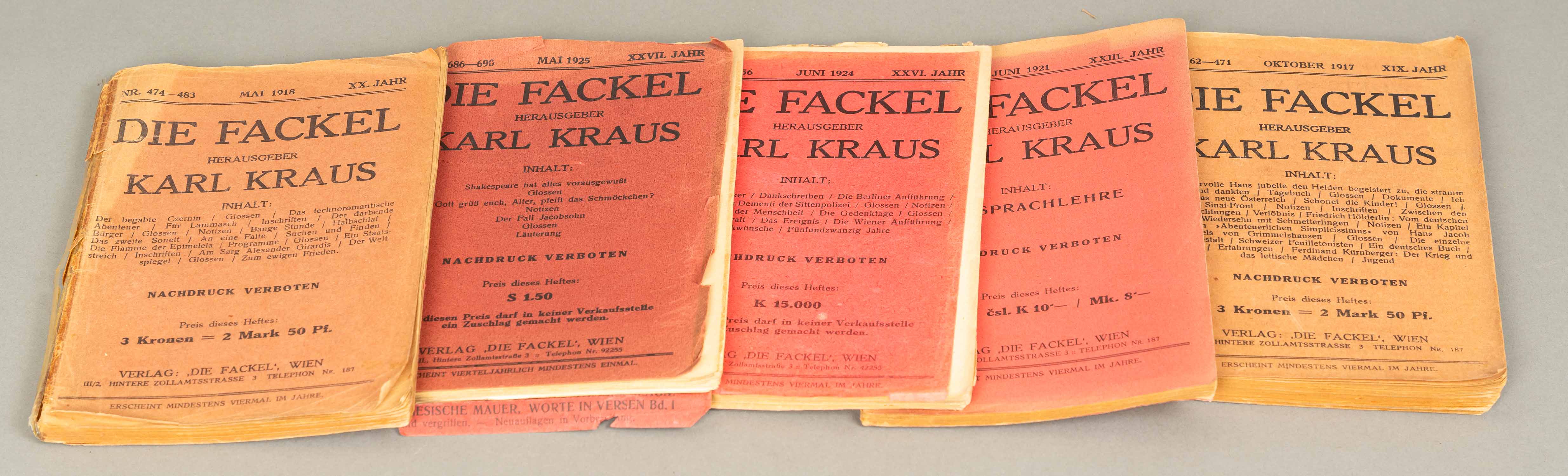 DEUTSCH AUCTIONEERS Lot265 in DetailKarl Kraus (1874-1936), five brochures Die Fakel, first edition. Numbered 649 - 656 / 686 - 609 / 474 – 783 / 572 - 576 / 462 – 671. Between 1917 and 1925. The hammer price will go directly to the social help of the Caritas of Vienna, Provenance; estate found Erzdiozese Wien.