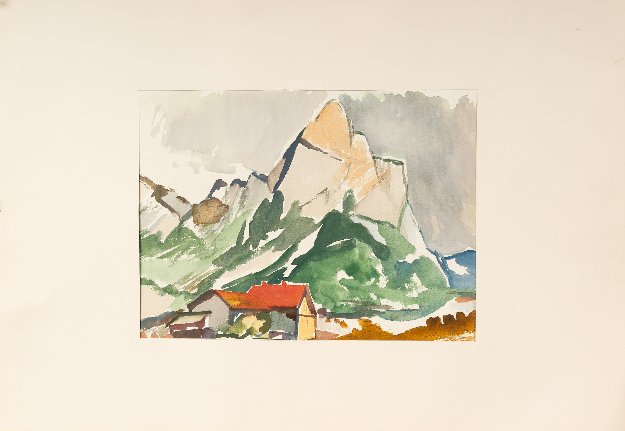 DEUTSCH AUCTIONEERS Lot276 in DetailKarl Gunsam ( 1900-1972), Mythen mountains swiss , water colour on paper. Describted and stamped on the reverse. Signed. 20 x 26 cm