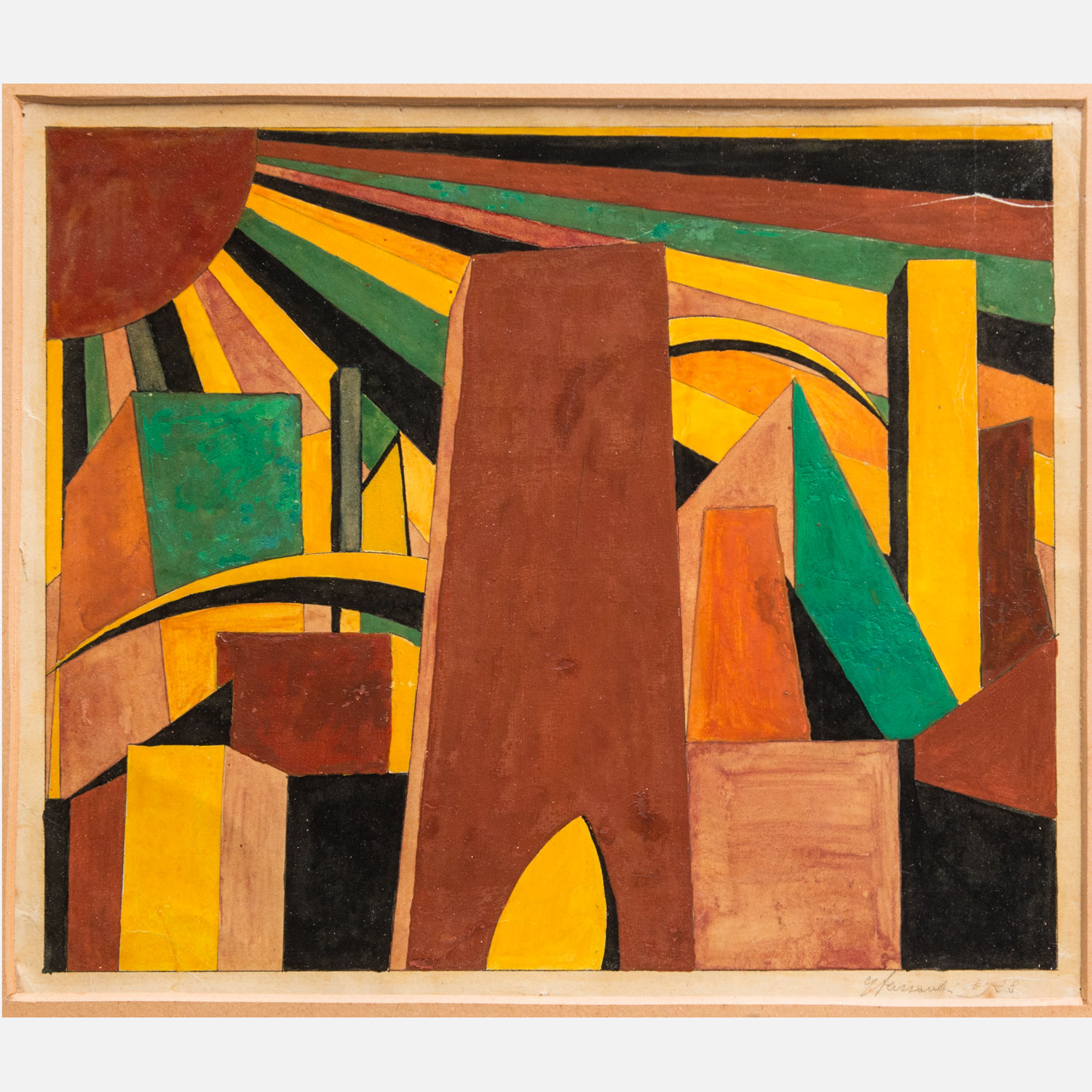 DEUTSCH AUCTIONEERS Lot278 in DetailFuturist movement around 1930, Sun and houses , watercolour on paper, signed and dated 1928, framed under glass. 30 x 36 cm.